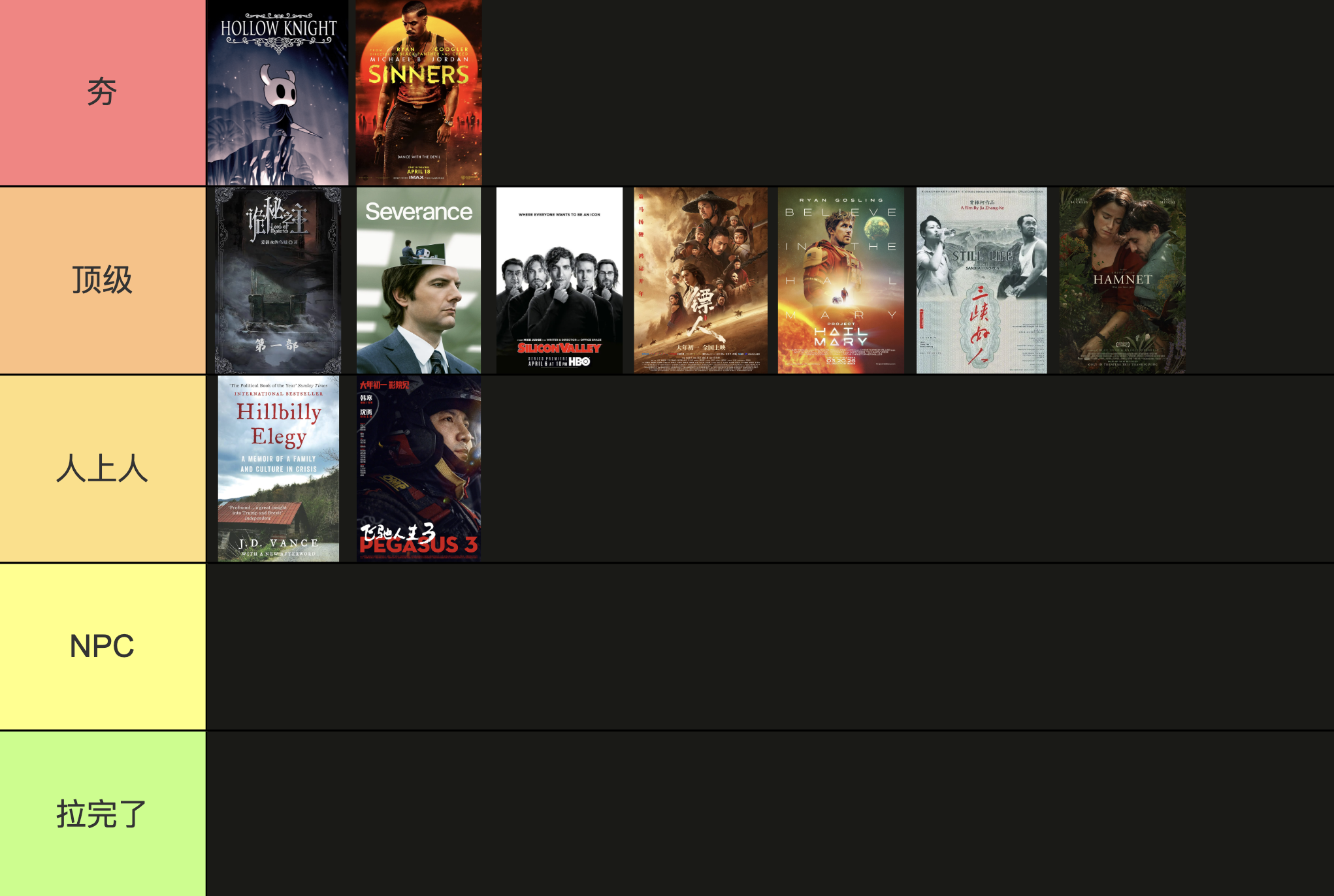 - 分别看一部⭐⭐⭐⭐⭐的书和电影。